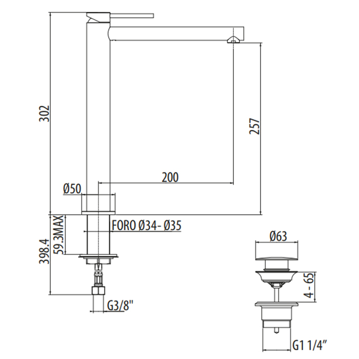 GATTONI CIRCLE ONE Смеситель для раковины высокий 302 мм, на 1 отверстие, излив 200 мм, с донным клапаном, цвет хром