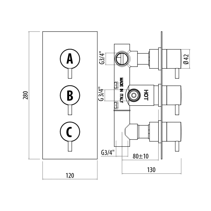 Gattoni Termostatici Термостатический встраиваемый смеситель для душа на 3 источника, (внутренняя+внешняя часть) на прямоуг. пластине, цвет хром