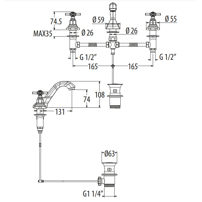 GATTONI TRD Смеситель для раковины на 3 отверстия, ручки Paris, высота излива 74 мм., с донным клапаном, цвет Золото 24К