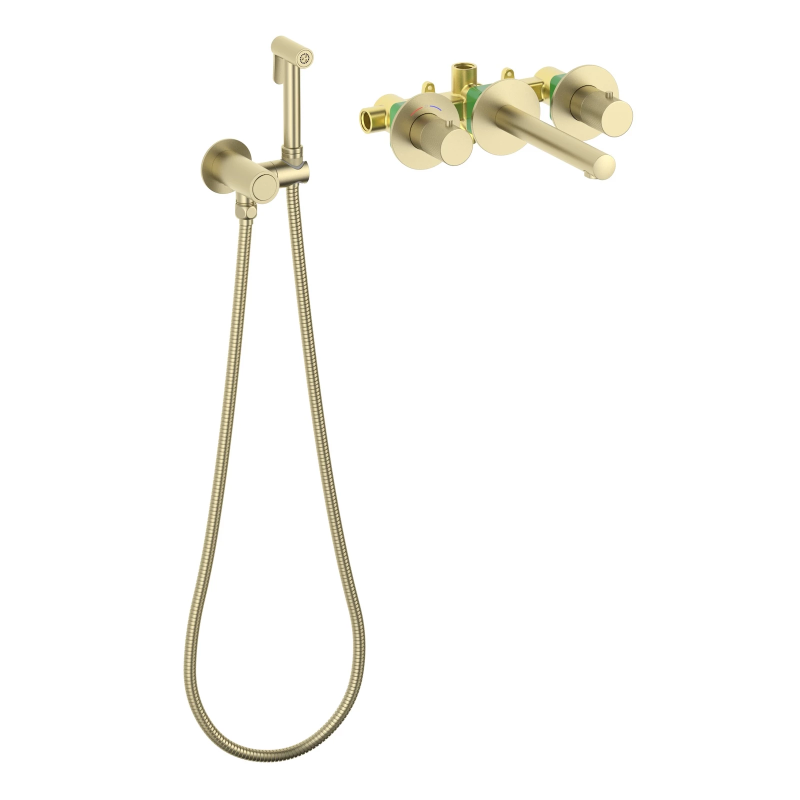 Смеситель для раковины встроенный с термостатом, с гигиеническим душем Timo Saona золото матовое (2383/17SM)