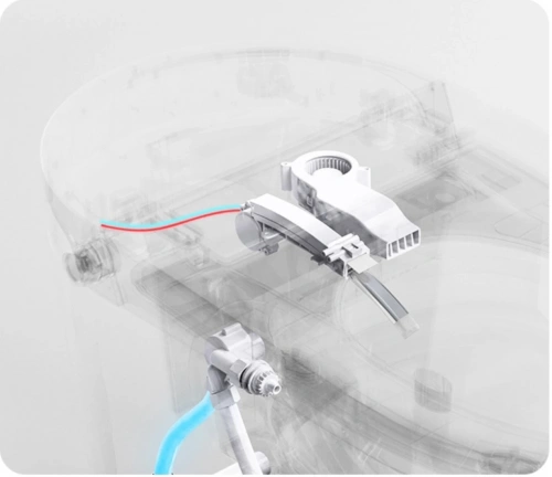 Электронный унитаз оснащен: несколькими функциями биде, самоочишающейся, двигающейся форсункой с настраиваемым напором воды, регулировкой положения, автоматическим открытием крышки, подогревом сиденья, быстрым нагреванием воды, сушкой, регулировкой температуры воды и сушки, регулировкой давления воды, автоматическим смывом, который также работает с отключенным питанием. ДУ пульт управления.
