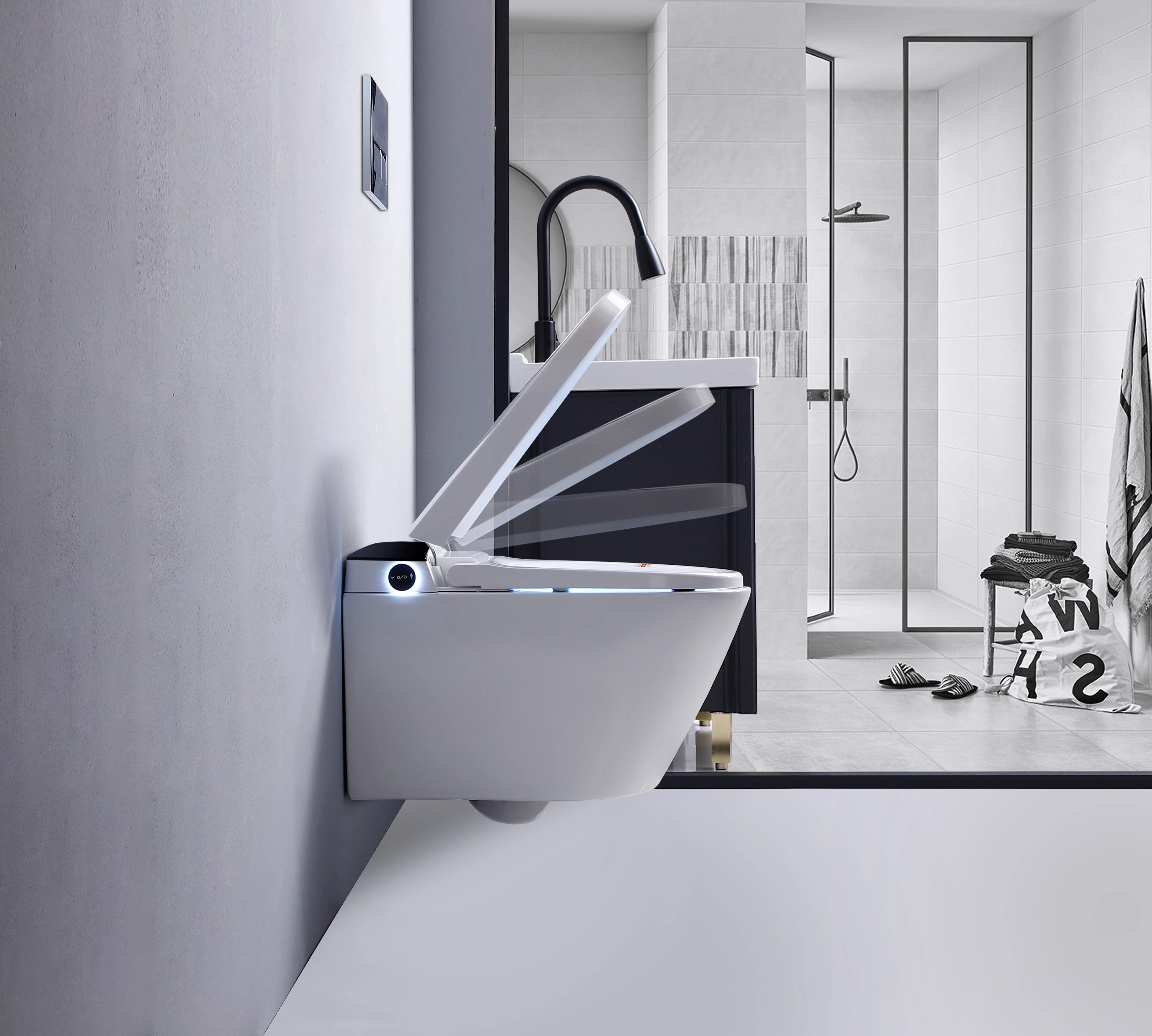 Электронный унитаз оснащен встроенным резервуаром, автоматическим смывом, который также работает с отключенным питанием, сушкой, автоматическим открытием/закрытием крышки, регулировкой температуры сиденья, воды, сушки, давления, функциями биде, самоочищающей форсункой.