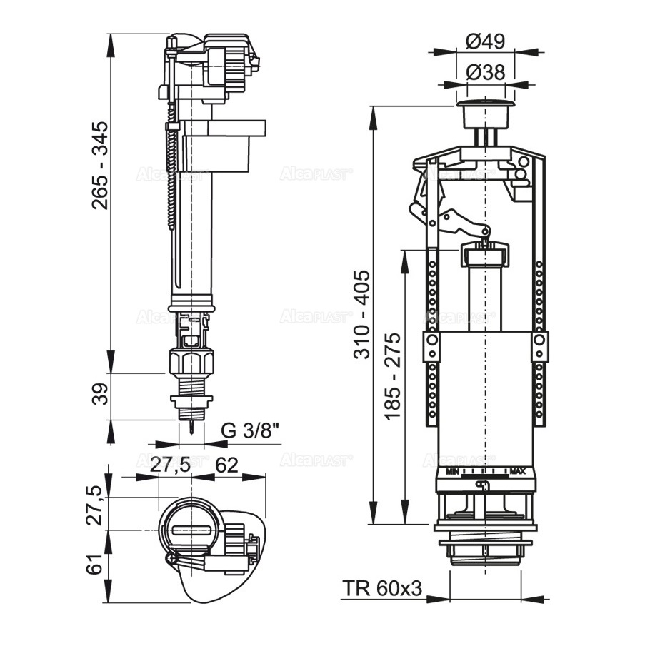 Выпускной комплект Alcaplast, со стоп кнопкой, впускной механизм А17, подключение 3/8'', хром (SA2000S 3/8" CHROM)