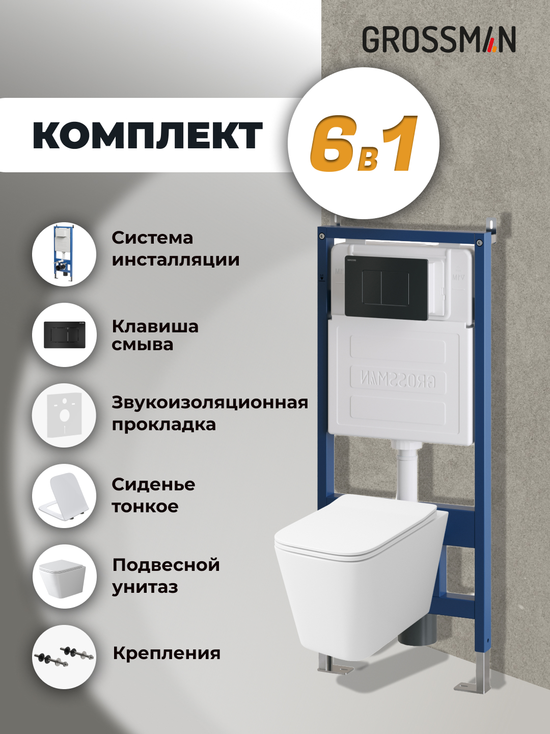 Комплект 3 в 1: Grossman инсталляция 900.K31.01.000+клавиша 700.K31.04.21M.21M черный матовый+унитаз GR-4479SQ, 3 места