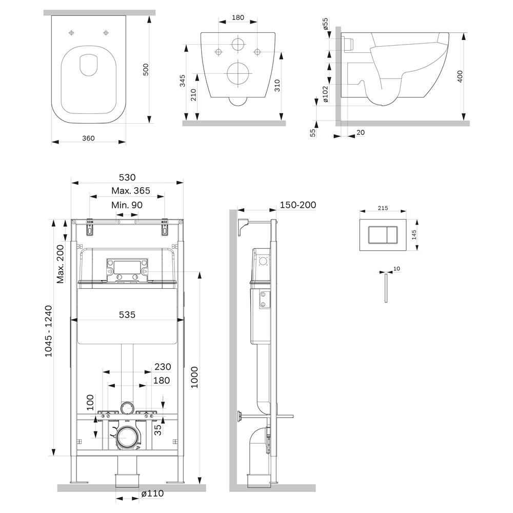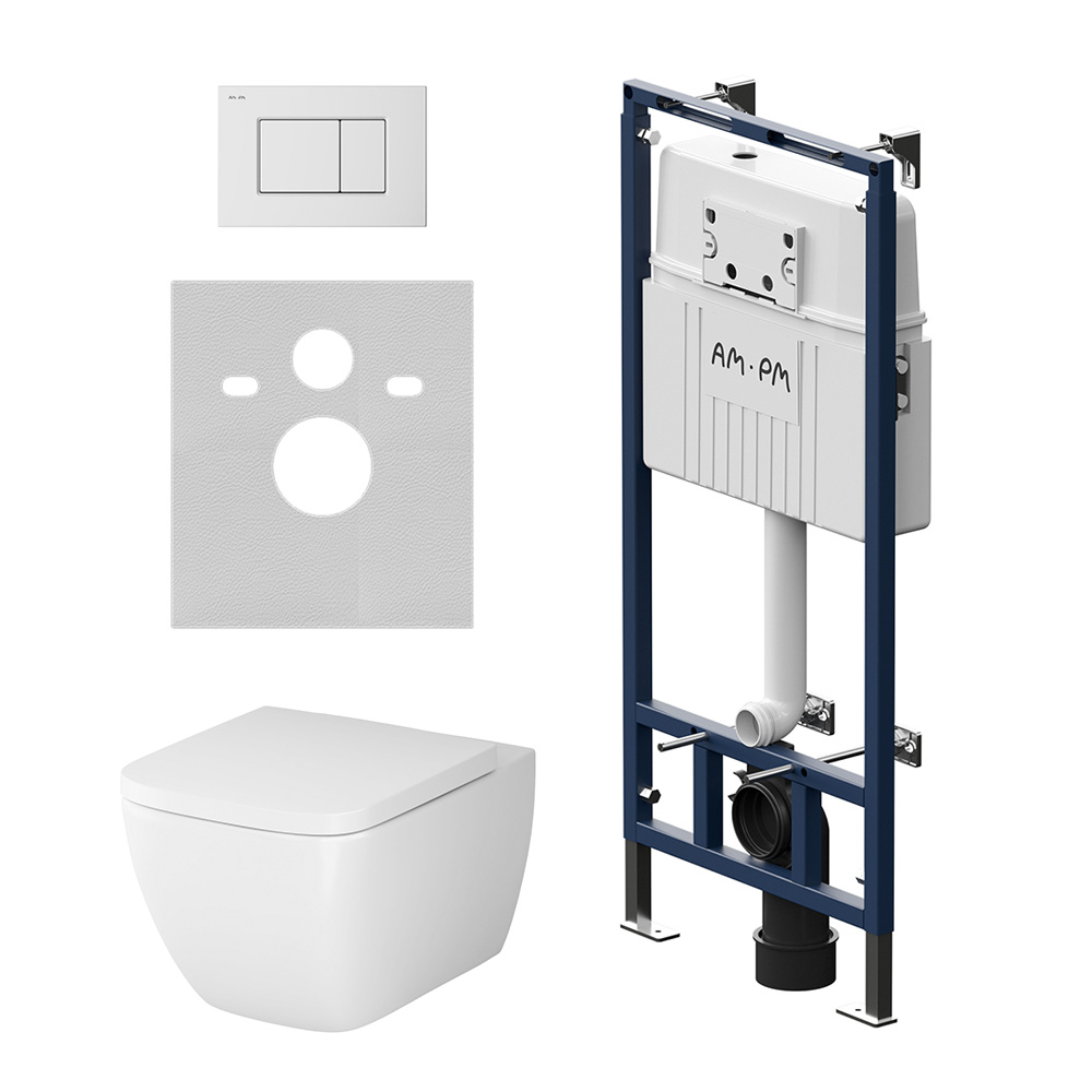 Полностью готовый к установке комплект: система инсталляции с клавишей подвесной унитаз с сиденьем включающий все необходимые крепления патрубки звукоизолирующую прокладку. Экономия пространства благодаря узкому бачку – 120 мм глубиной. Заливной клапан с низким уровнем шума - Класс II согласно европейского стандарта EN 14124.