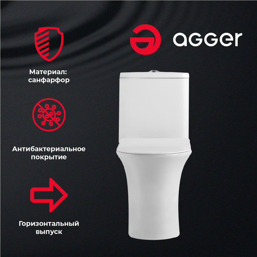 Agger AT01000 Унитаз-компакт безободковый пристенный с горизонтальным выпуском: санфарфор, скрытая система монтажа. Обтекаемая форма корпуса, не позволяющая скапливаться пыли, двойной режим слива с возможностью регулировки, ультратонкое и быстросъёмное сиденье из дюропласта с функцией плавного закрывания Soft-close. Тип смыва - воронка-водоворот, двойной режим смыва 3/6 л.