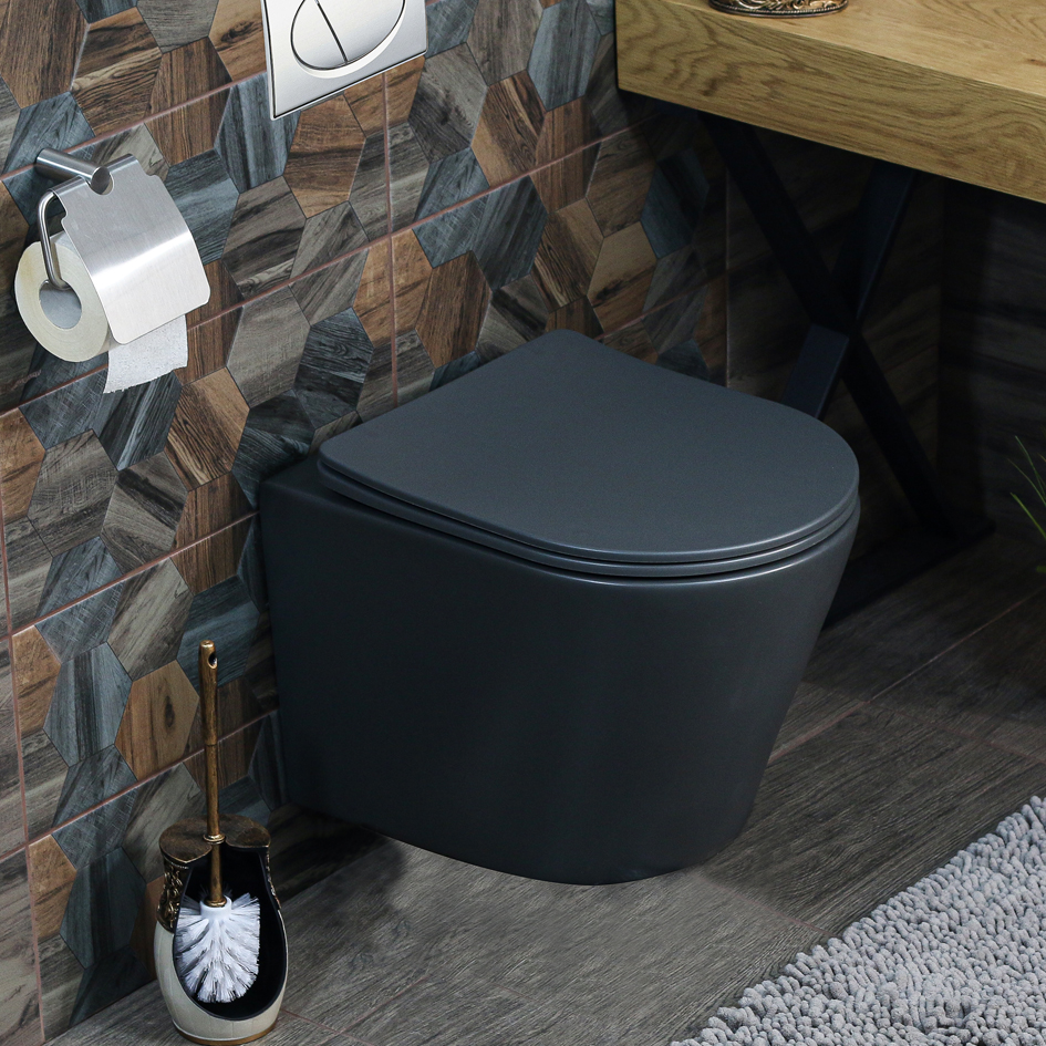 Унитаз подвесной, безободковый. Размер 365*480*360 мм. В комплекте с крышкой и сиденьем, с микролифтом, быстросъемное. Межосевое расстояние под креп. шпильки, мм - 180. Цвет: матовый темно-серый