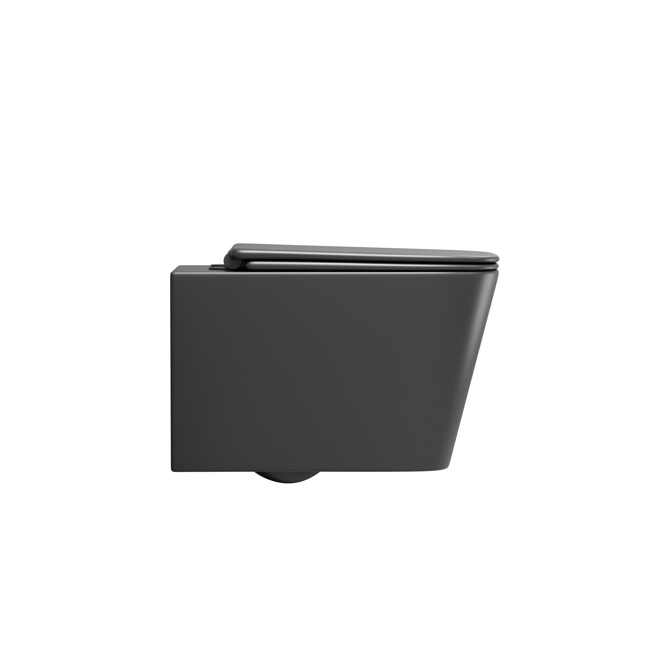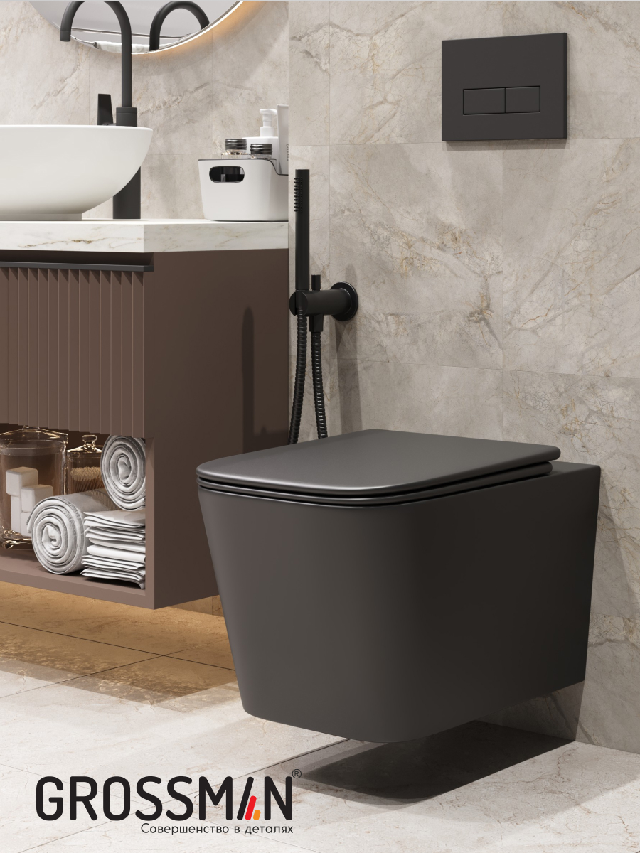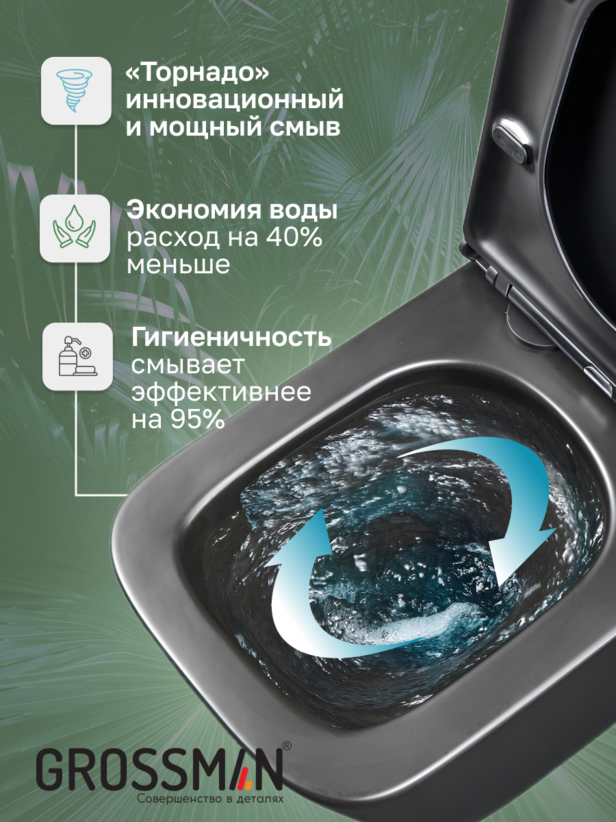 Унитаз подвесной Grossman GR-4404BMSQ (520х373х365) безободковый,черный матовый с тонкой крышкой,микролифт,смыв торнадо,1 место