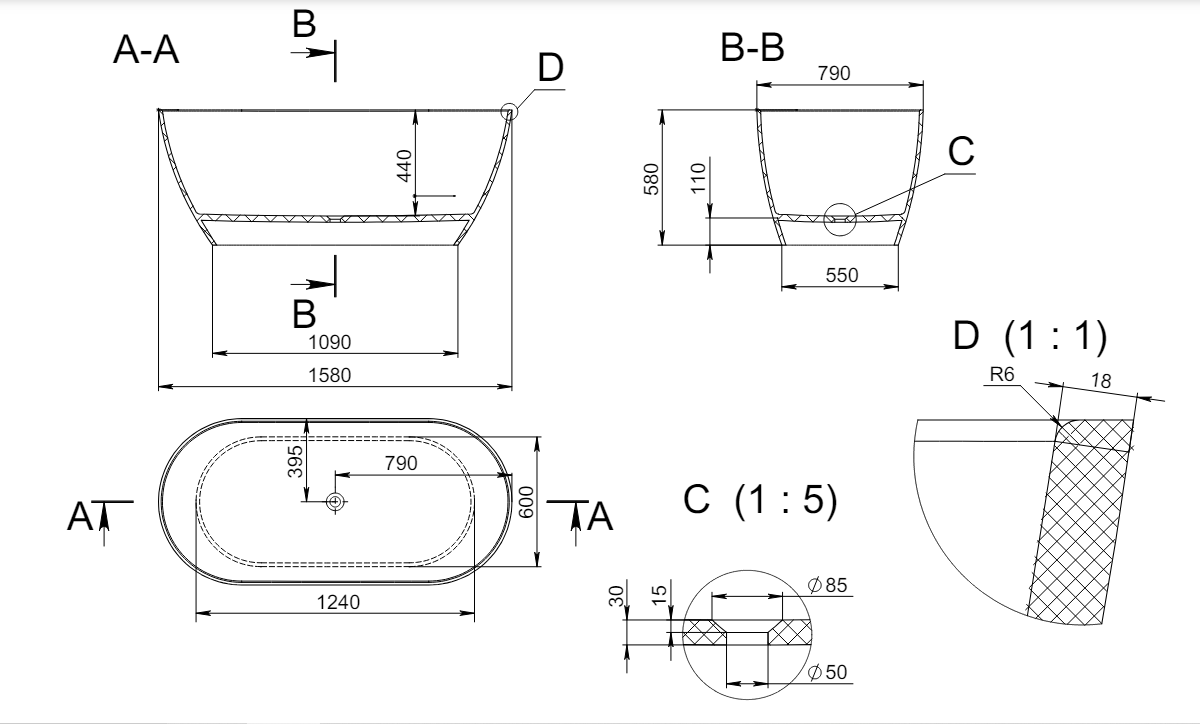 Ванна белая матовая на всю толщину