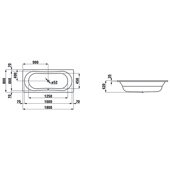 Laufen THALLIUM Стальная ванна (3,5мм) встр., 1800x800 мм, прямоуг, с центр. выпуском, шумоиз-я, без отв.я для ручек, с антискольз. покрытием, белый