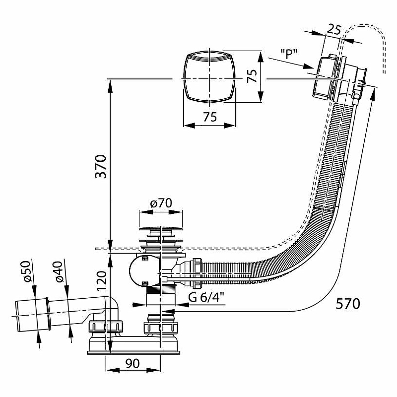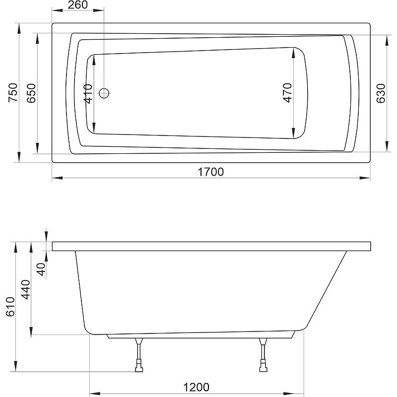 - Размер ванны (ШхВхГ): 170х44х75 см.