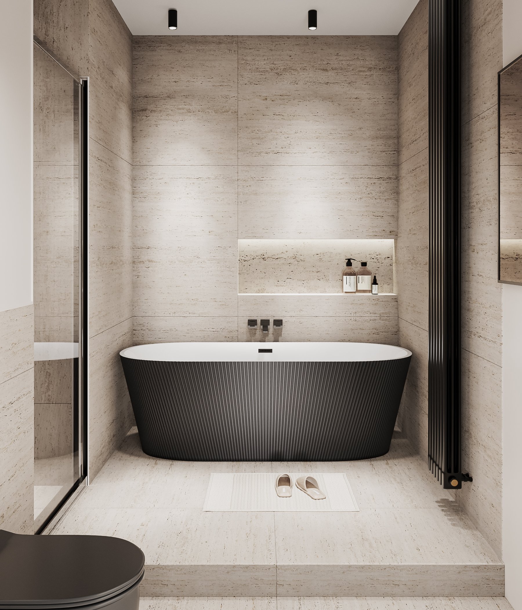 Ванна изготовлена из акрилового листа толщиной 5 мм, что обеспечивает прочность и долговечность изделия. Акриловый материал также приятен на ощупь и сохраняет тепло воды на длительное время, создавая комфорт при принятии ванны. Ванна выполнена в черном матовом цвете снаружи и в белом внутри.