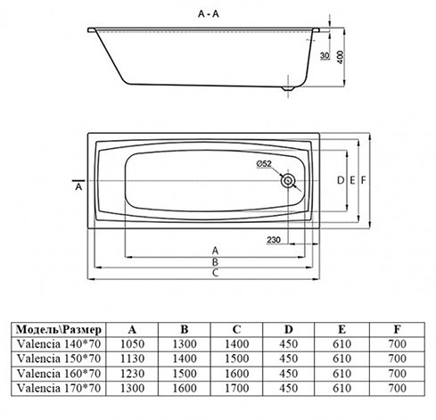 Ванна Valencia прямоугольная 170х70