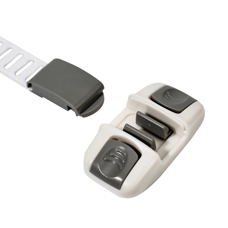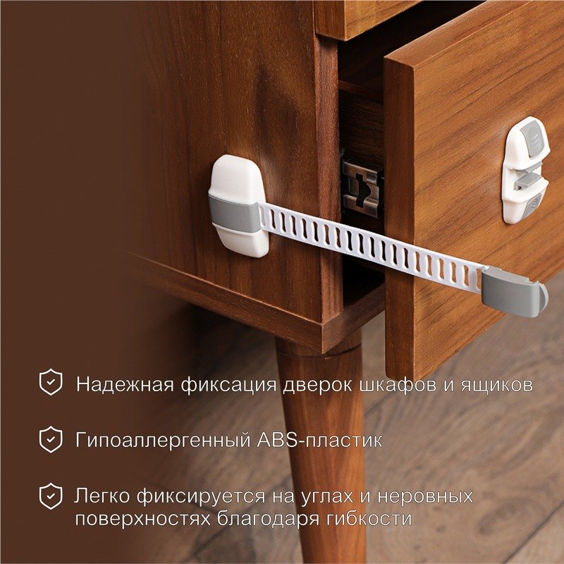 Блокиратор препятствует открыванию ящиков, дверей, шкафов, холодильников, морозильных камер, микроволновых печей и т.д. Защищает детей от доступа к опасным предметам, не позволяет прищемить пальчики дверцами или ящиками.<br> Конструктивно блокиратор состоит из двух крепежей и фиксатора, длина которого регулируется.<br> Благодаря гибкому материалу может применяться на углах и неровных поверхностях. Надежно крепится при помощи самоклеящегося липкого основания.<br> Изготовлен из гипоаллергенного пластика (ABS).