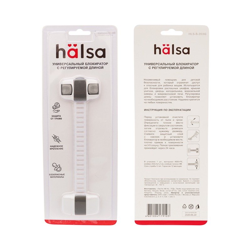 Универсальный гибкий блокиратор HALSA препятствует открыванию ящиков, дверей, шкафов, холодильников, морозильных камер, микроволновых печей и т.д. Защищает детей от доступа к опасным предметам, не позволяет прищемить пальчики дверцами или ящиками.<br> Конструктивно блокиратор состоит из двух крепежей и эластичного фиксатора. Благодаря гибкому материалу может применяться на углах и неровных поверхностях. Надежно крепится при помощи самоклеящегося липкого основания.<br> В комплекте поставляются 2 блокиратора из белого гипоаллергенного пластика (ABS).