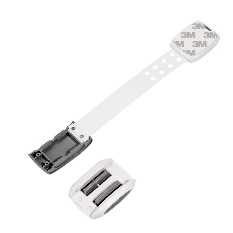 Блокиратор препятствует открыванию ящиков, дверей, шкафов, холодильников, морозильных камер, микроволновых печей и т.д. Защищает детей от доступа к опасным предметам, не позволяет прищемить пальчики дверцами или ящиками.<br> Конструктивно блокиратор состоит из двух крепежей и фиксатора, длина которого регулируется.<br> Благодаря гибкому материалу может применяться на углах и неровных поверхностях. Надежно крепится при помощи самоклеящегося липкого основания.<br> Изготовлен из гипоаллергенного пластика (ABS).