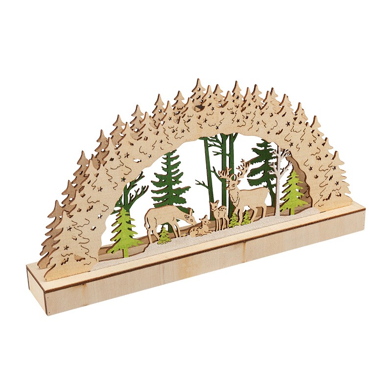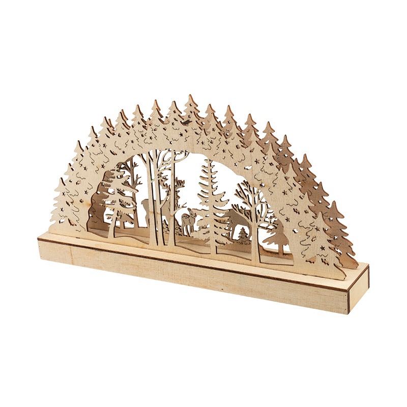 Деревянная фигурка с подсветкой «Домик в лесу» 19×6×26 см — необычный интерьерный декор, выполненный из экологичных безопасных материалов – натуральной древесины и нетоксичных красителей. В резном корпусе в виде домика с крышей находятся фигурки елей и маленького олененка, гуляющего в лесу. Композиция подсвечивается шестью диодами, излучающими теплый белый свет. Изделие работает от двух батареек типа ААА, что делает его мобильным. Деревянная фигурка с подсветкой станет оригинальным украшением вашего дома, создаст атмосферу уюта и тепла в долгие зимние вечера.