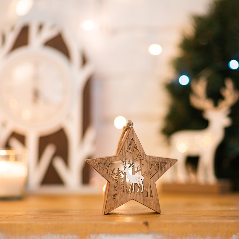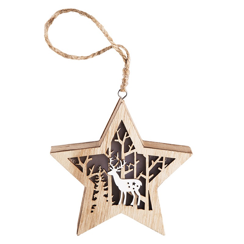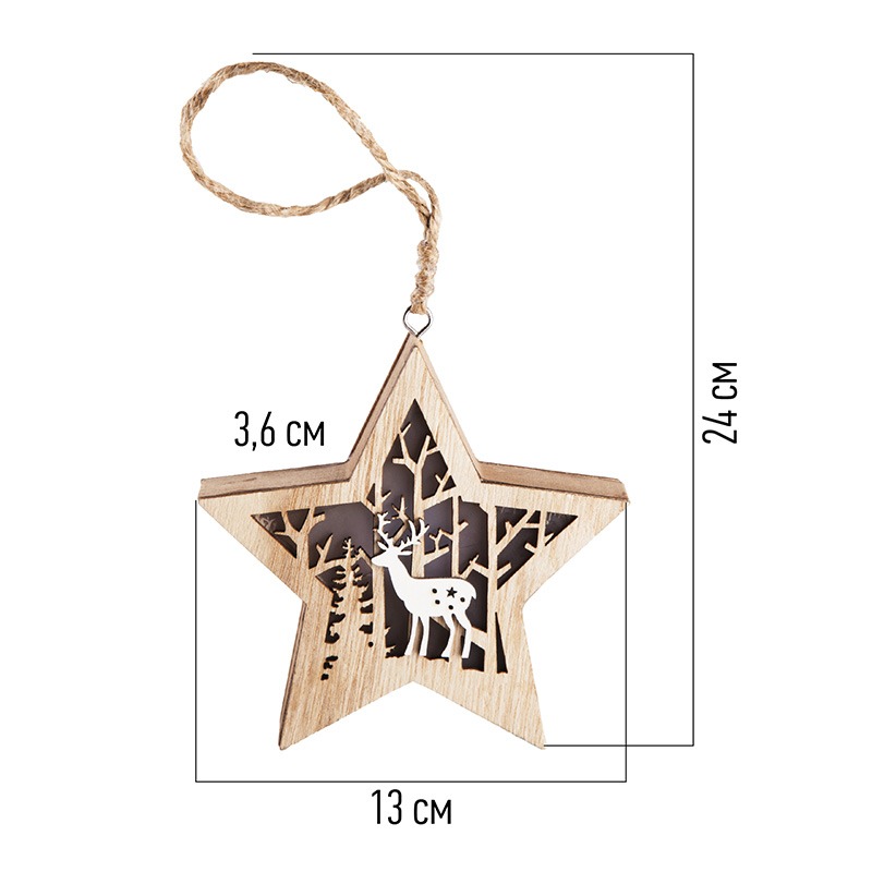 Деревянная фигурка с подсветкой «Звездочка» 24×13×3,6 см — интересное решение для украшения интерьера, которое поможет создать атмосферу уюта и тепла. Изделие выполнено из природной древесины в виде пятиконечной звезды, переднюю часть украшают резные фигурки оленя и деревьев. Композиция подсвечивается одним ярким диодом, излучающим теплый белый свет. Светодиод питается от одной батарейки CR2032, идущей в комплекте. В верхней части есть мягкая джутовая нить для подвешивания.