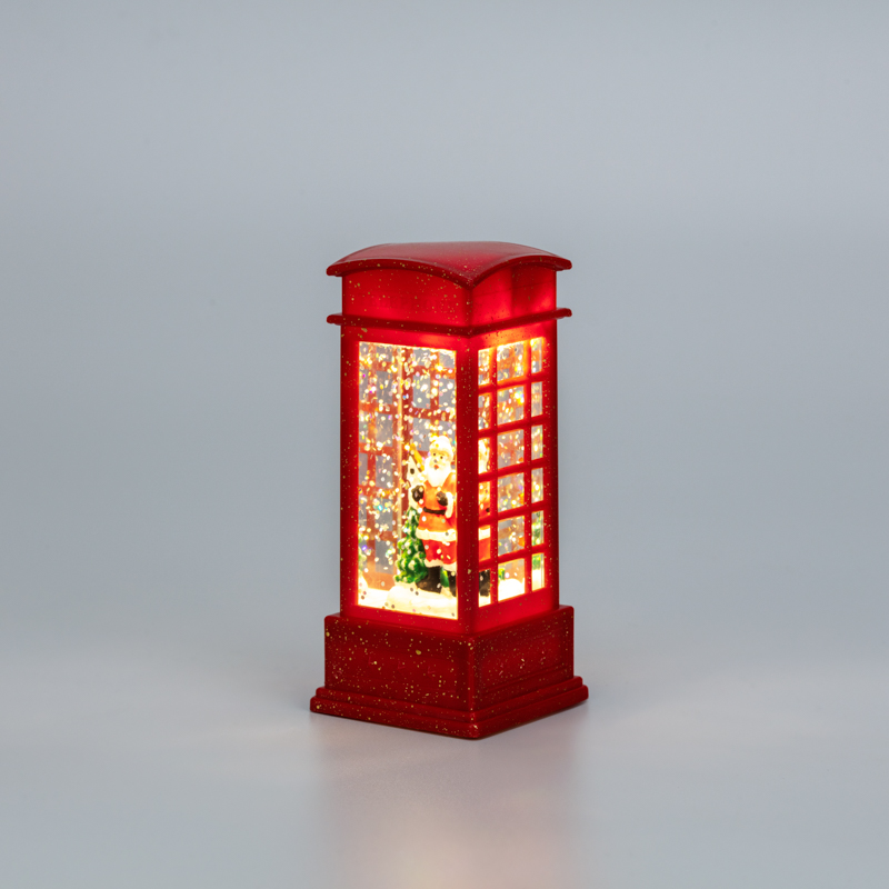 Светильник с эффектом снегопада и подсветкой выполнен в форме телефонной будки, внутри которой находятся фигурка Санта Клауса.