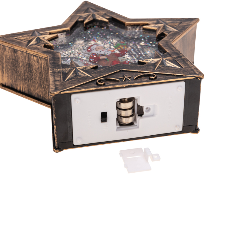 Прозрачная колба светильника наполнена жидкостью с металлизированным конфетти, которая начинает циркулировать сразу после включения. Такой эффект снегопада сразу погружает в незабываемую атмосферу зимней сказки.