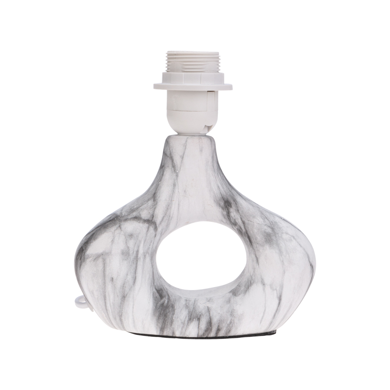 Декоративный настольный светильник с основанием в форме кольца под белый мрамор и черным абажуром станет современным и стильным интерьерным украшением.