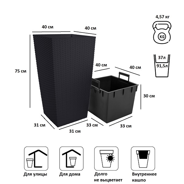 Кашпо для цветов Rato Square является замечательным украшением садового интерьера, дома, зоны отдыха. Изделие выполнено с имитацией под натуральный ротанг, что делает его стильным элементом декора. Благодаря прочному пластику оно устойчиво к ультрафиолетовым лучам. Кашпо для цветов Rato Square состоит из двух предметов: внутренней емкости, куда сажают растение, и декоративной емкости.