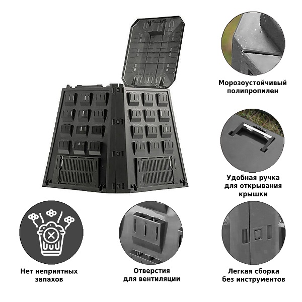 Компостер Evogreen IKEV 420C 420 л – идеально подходит для садоводства. Конструкция быстро и легко собирается, а небольшие отверстия – постоянную подачу воздуха. Дополнительным преимуществом этого компостера является его устойчивость к повреждениям и плохим погодным условиям.