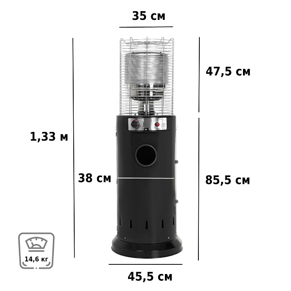 Подходит под любой газовый баллон до 27 л включительно (высота 59 см, диаметр 30 см). Газовый баллон в комплект не входит, регулятор и шланг – входят.<br>