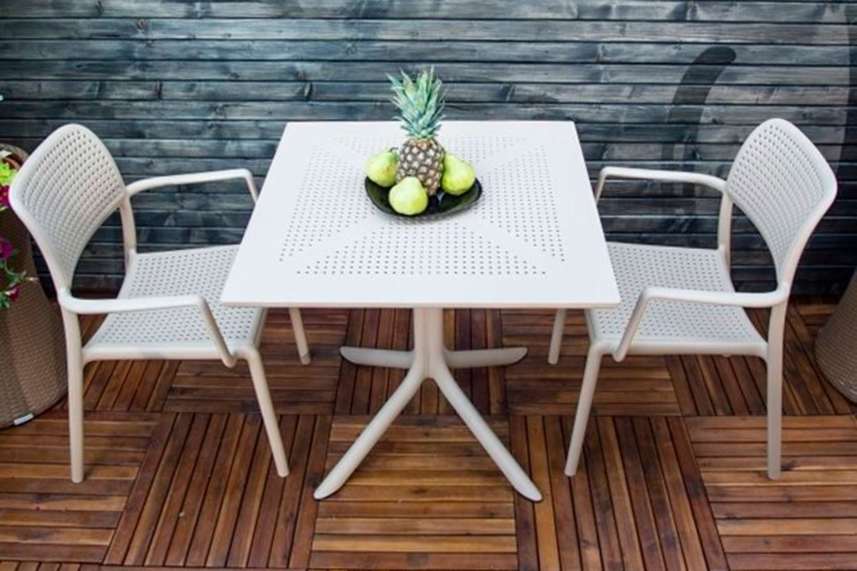 Для получения идеальной комплектации рекомендуем вам купить квадратный пластиковый стол Clip 80 от Nardi со стульями Bora и Bora Bistrot или креслами Acquamarina и Darsena из серии LEKKO от итальянских дизайнеров.