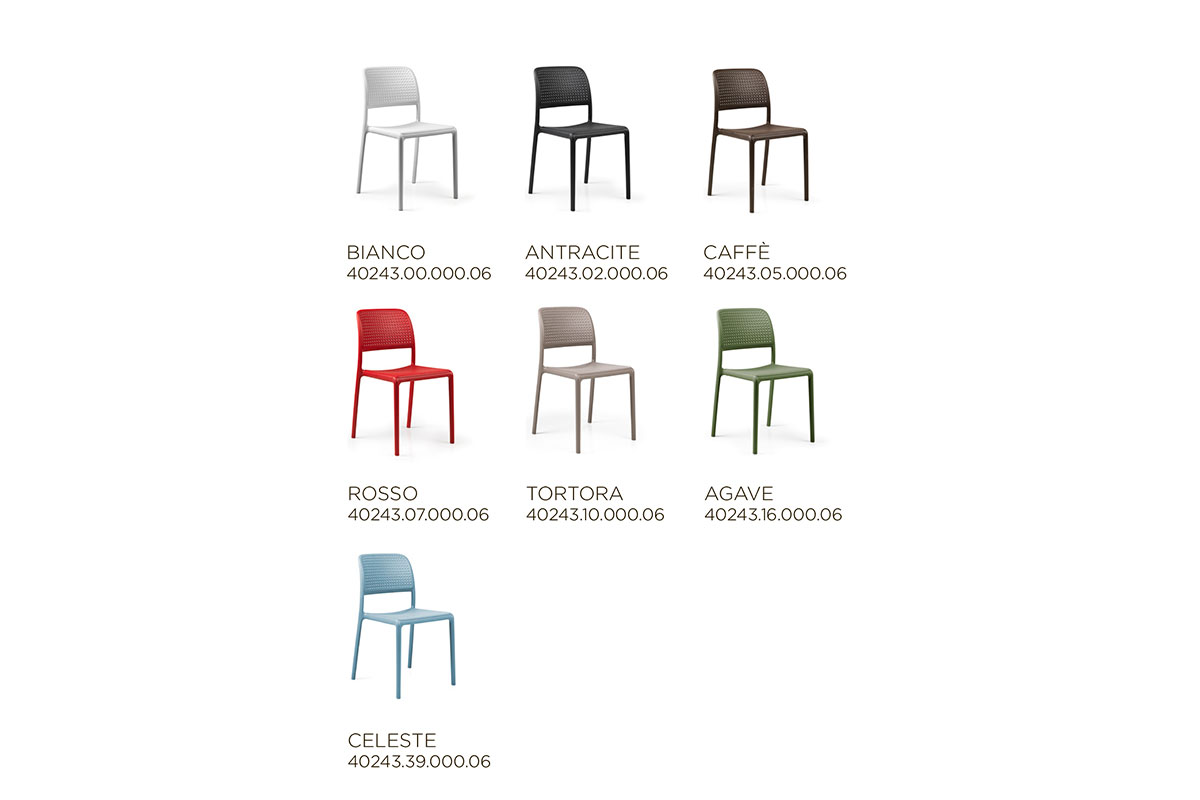 Стул легкий, удобный в использовании и хранении - штабелируется (до 24 стульев), нескользящие ножки, рама Bora Bistrot трубчатая и бесшовная, с закругленными углами и профилями. Стул представлен в широкой цветовой гамме с матовой отделкой.