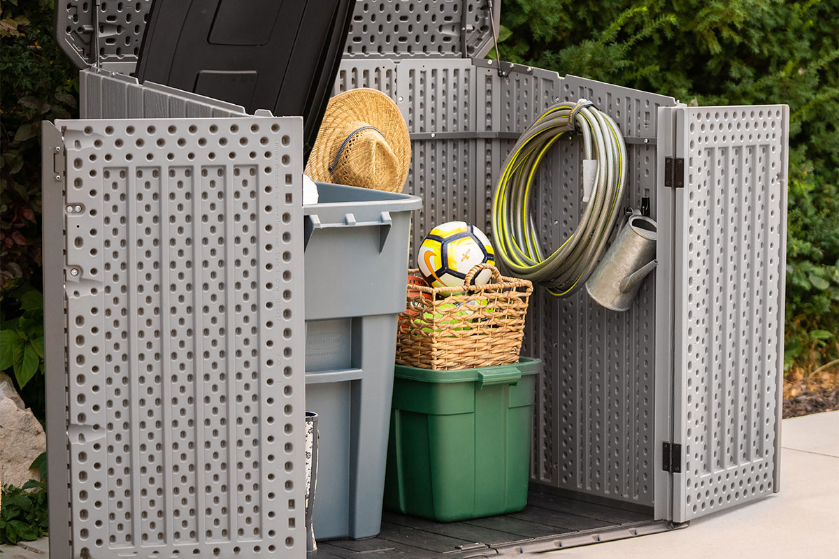 Ящик-шкаф пластиковый WoodLook, 1380 л – абсолютно водонепроницаемый, всепогодный, подходит для хранения мусорных баков и садового инвентаря