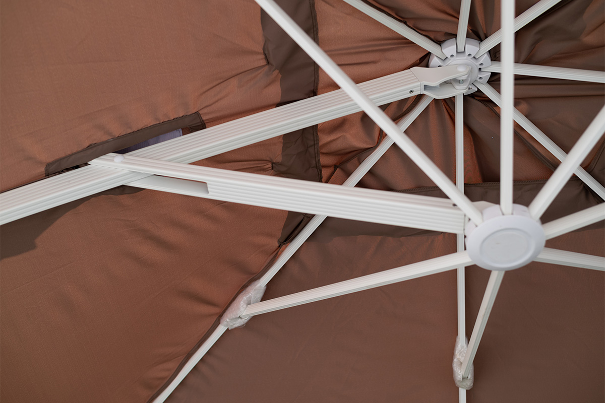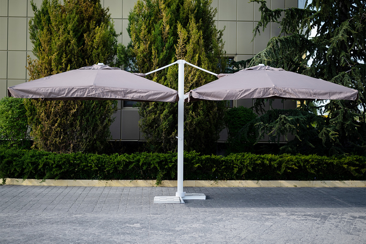 В сочетании с комплектами мебели из искусственного ротанга и шезлонгами зонты создадут уютную атмосферу на вашем загородном участке, террасе, веранде, а также на территории уличного кафе, ресторана или пляжа. Благодаря боковому расположению стойки под куполом можно установить любую пластиковую мебель: от дивана или шезлонга до обеденного стола со стульями.