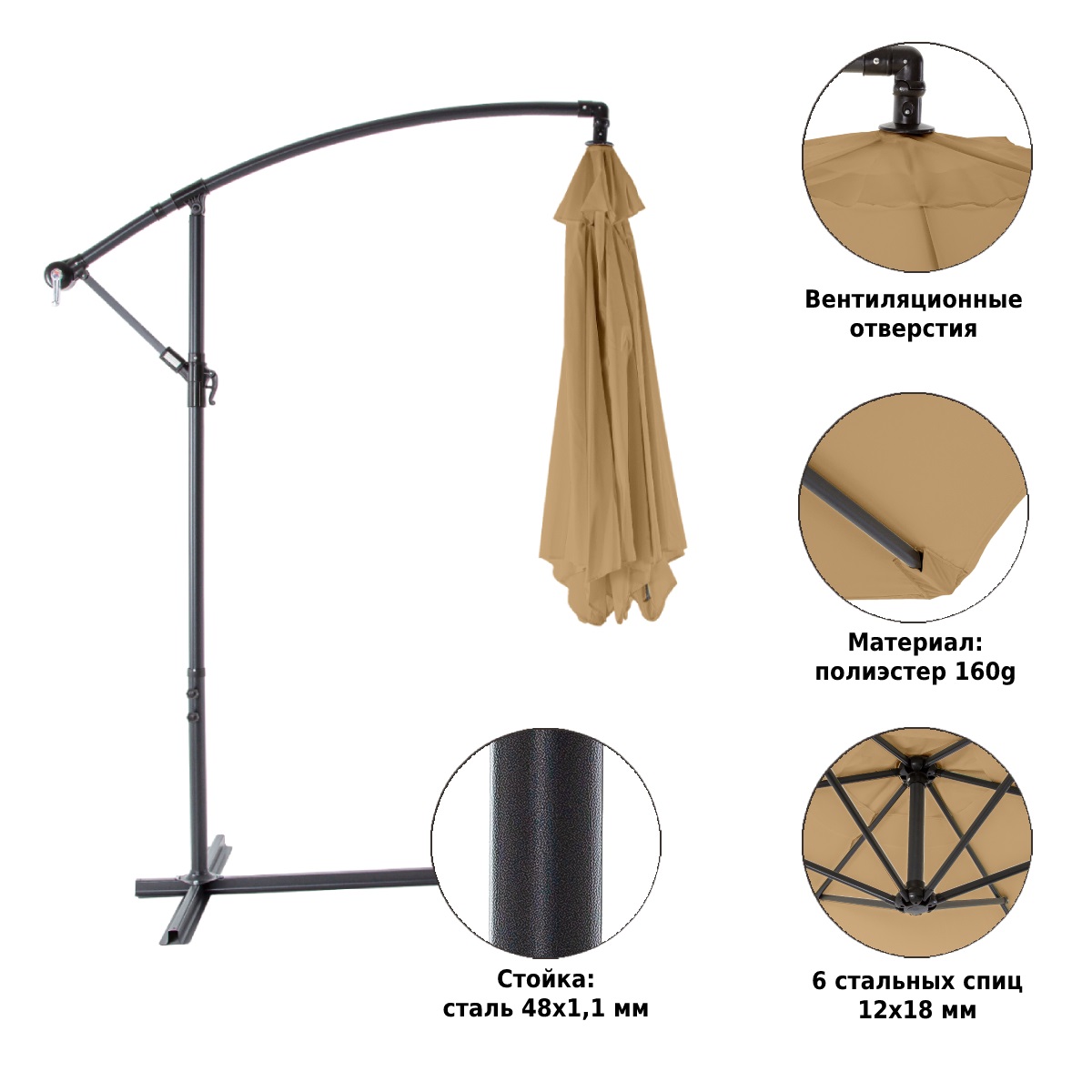 В комплекте с зонтом идет основание – крестовина, на которую для устойчивости можно установить бетонные утяжелители (в комплект не входят) или привернуть ее через имеющиеся отверстия к полу.