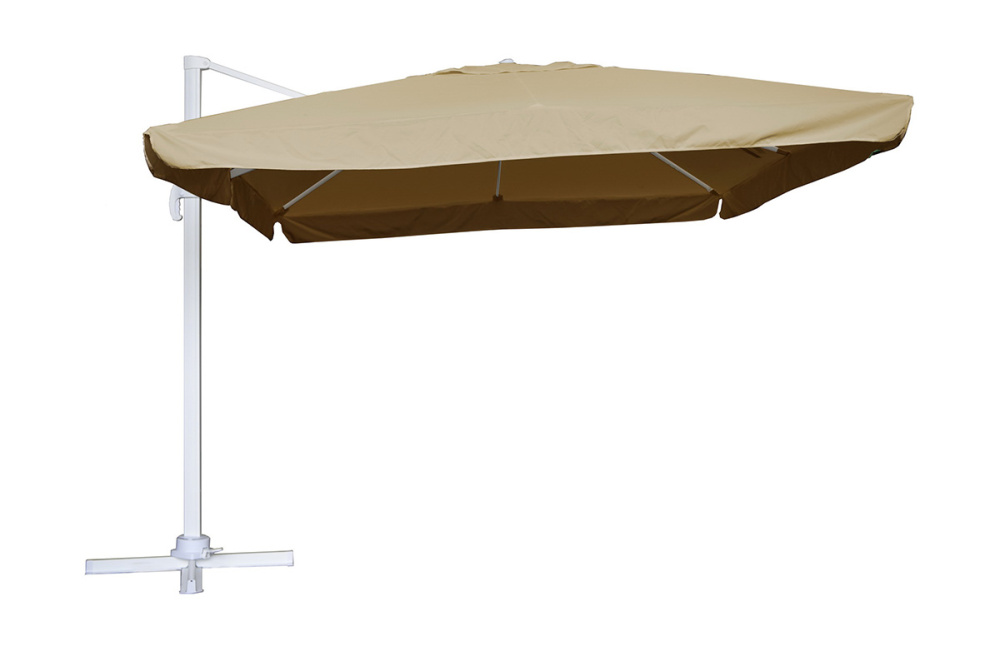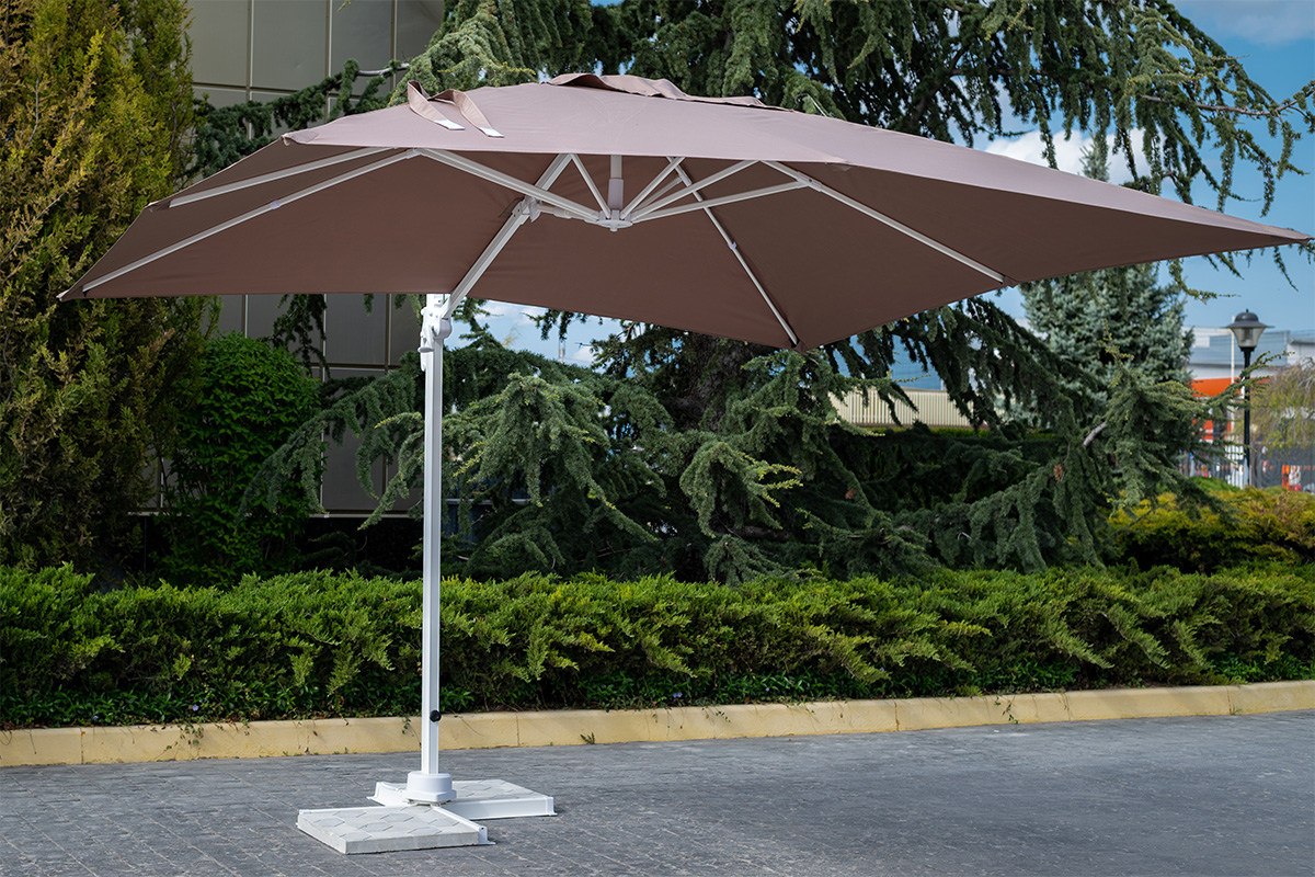 В сочетании с комплектами мебели из искусственного ротанга и шезлонгами зонты создадут уютную атмосферу на вашем загородном участке, террасе, веранде, а также на территории уличного кафе, ресторана или пляжа. Благодаря боковому расположению стойки под куполом можно установить любую пластиковую мебель: от дивана или шезлонга до обеденного стола со стульями.