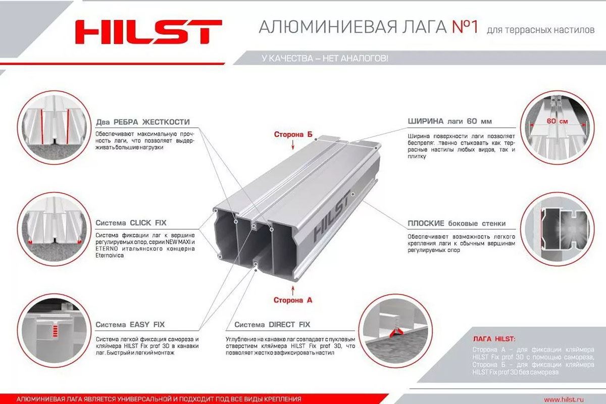 ВНИМАНИЕ! Если Вам необходима длина лаг более 4 метров, то можно приобрести пластиковый соединитель для лаг HILST connect 3D.Дополнительные преимущества монтажа настила на алюминиевые лаги и регулируемые опоры
