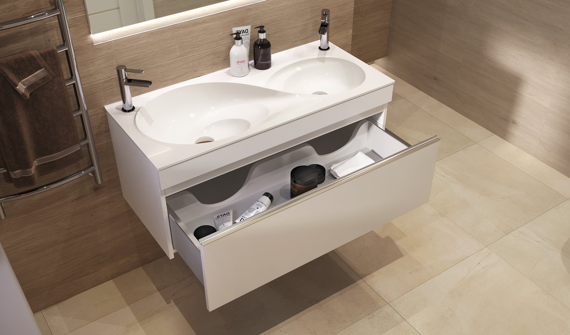 Они подойдут для парфюмерии, белья, бытовой химии, необходимой для уборки помещения. Зона вокруг раковины тоже может использоваться. Здесь можно с комфортом расположить туалетные принадлежности и мелочи, которые должны всегда быть под рукой. Для традиционных подвесных раковин такое попросту невозможно.